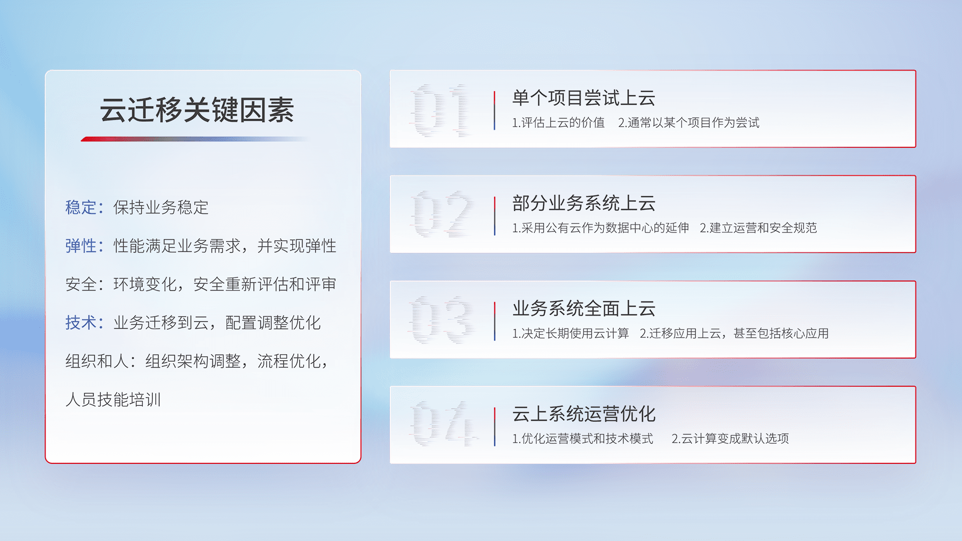 结合实际业务,,,从规划设计、、、、云平台选型、、、、云原生改造、、数据迁移、、、、集成交付,,迁移全过程为客户识别最佳上云路径,,,做好风险识别管理,,,,设计网络架构、、、身份权限、、、安全审计合规、、、、操作审计、、、、日志审计、、、监控告警策略、、、多站点容灾设计等,,对云上基础设施进行整体规划,,,提升IT治理水平,,,,以满足弹性、、高可用、、高性能的需求。。。