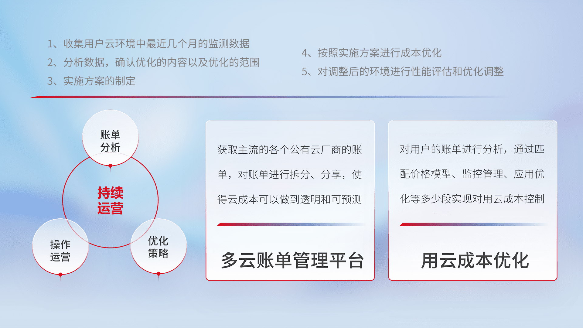 通过多云纳管,,以统一的资源数据模型把客户的云资源进行抽象和封装,,进而实现对多云资源的统一操作,,,保障云资源管理的可靠性、、、、稳定性与可用性。。量身定制化运维内容,,,,配置、、开发运维、、补丁管理、、备份、、、监控、、认证和访问管理、、、审计和日常巡检等,,,,保障在用云过程中的可靠度,,,,稳定度以及高可用率。。。